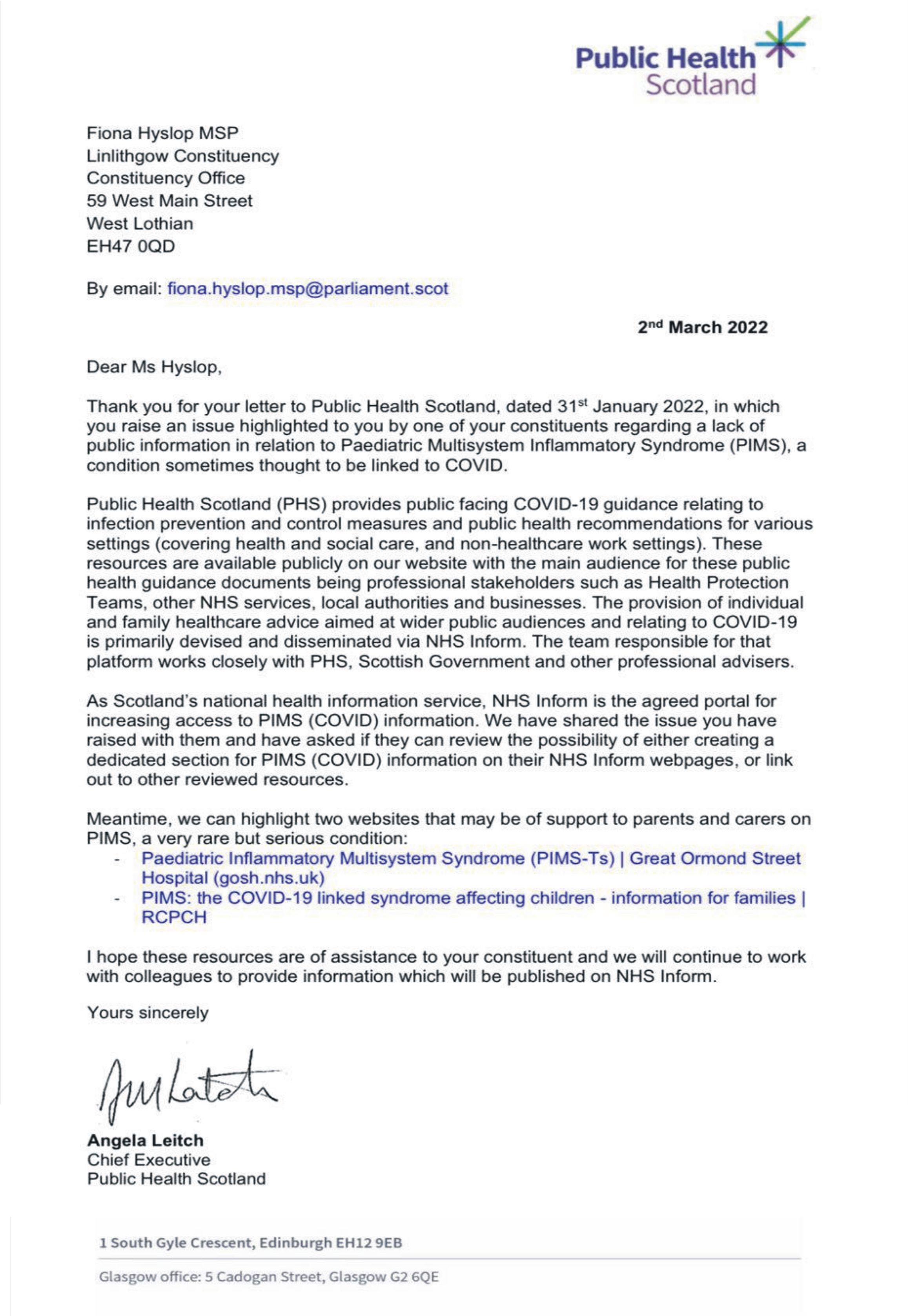 Letter 4. However, a PIMS member in Scotland received an appropriate and promising response from the chief executive of Public Health Scotland, who has asked NHS Inform to consider adding PIMS information to their web pages.