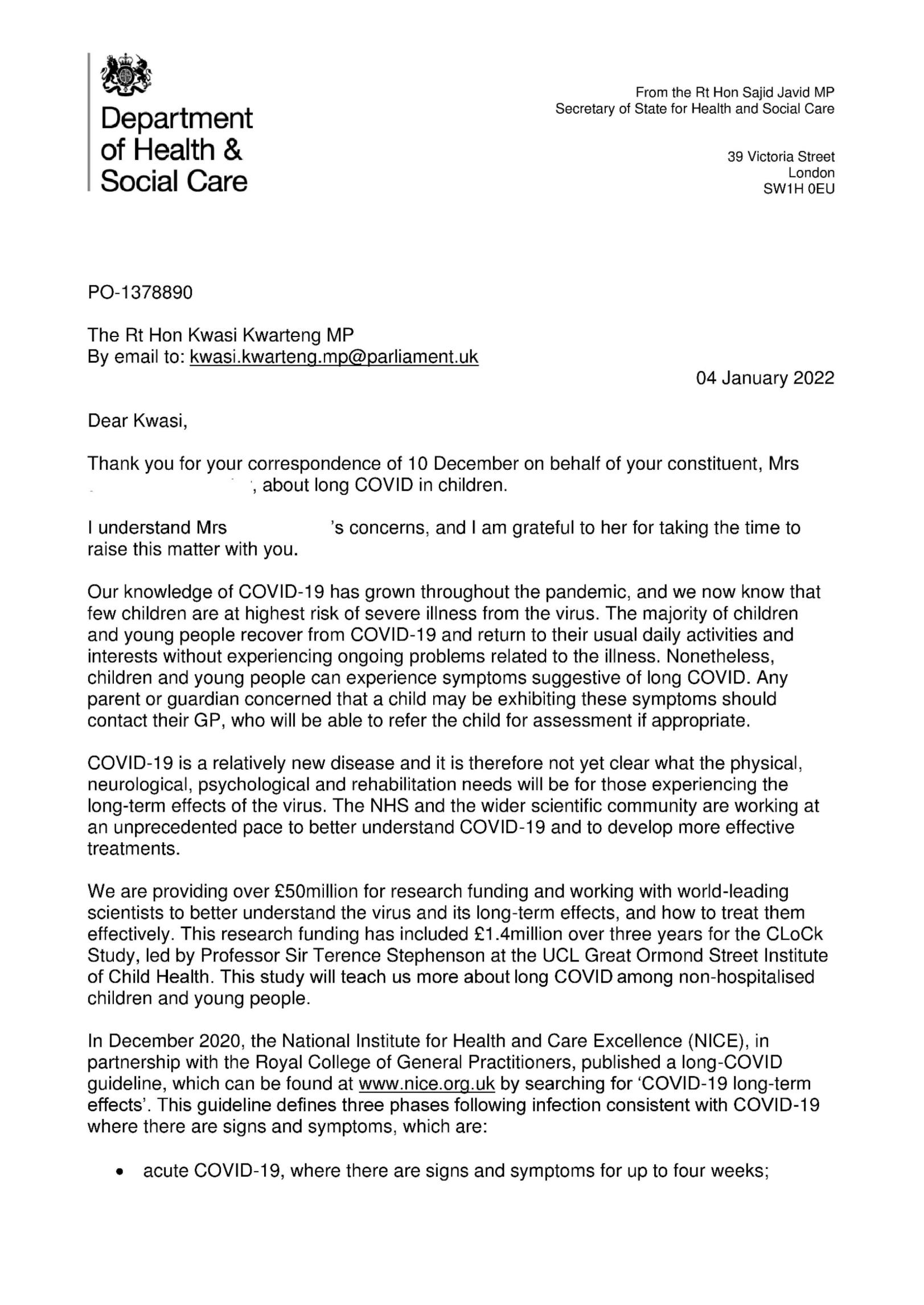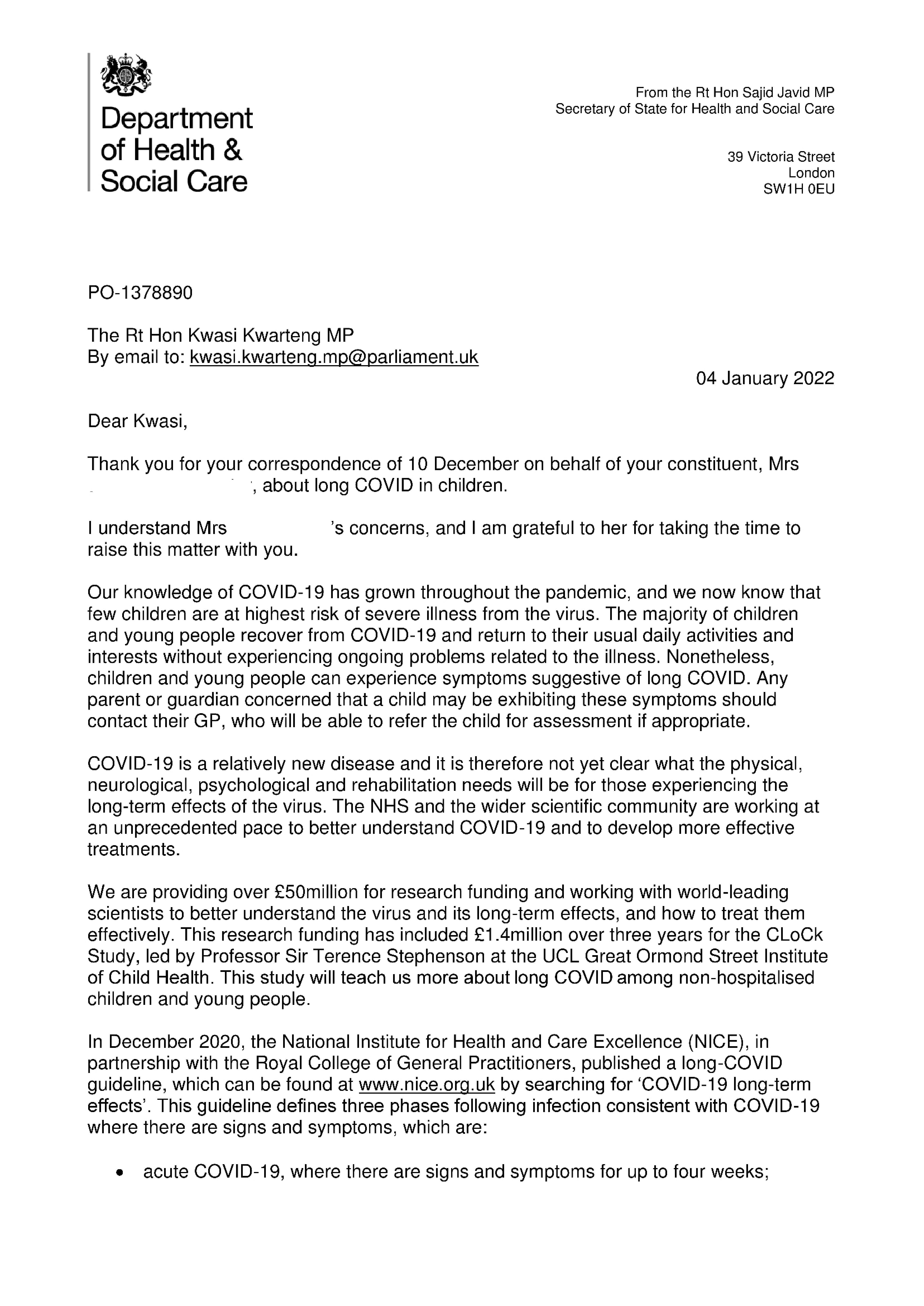 Letter 2. Sajid Javid's reply to a group admin apparently under the impression that PIMS is Long COVID.
